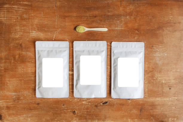 Three Blank Plastic Packaging Bags with Isolated White sticker on a wooden table Mock Up